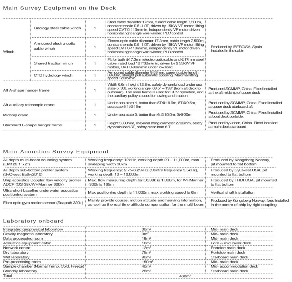 ZhangJian has overall length of 97.55m, moulded width of 17.8m, moulded depth of 8.4m, displacement of 4800T, cruising ability of 15,000 nautical miles, and personnel of 60 persons. The vessel with DP1 is driven by CPP propulsion system with one big and one small main engines, and 3 pitch-adjustable bow thrusters. Acoustic equipment transducer is pit-mounted in the bottom of vessel. The vessel has a 600m² aft deck and 468m² laboratory.